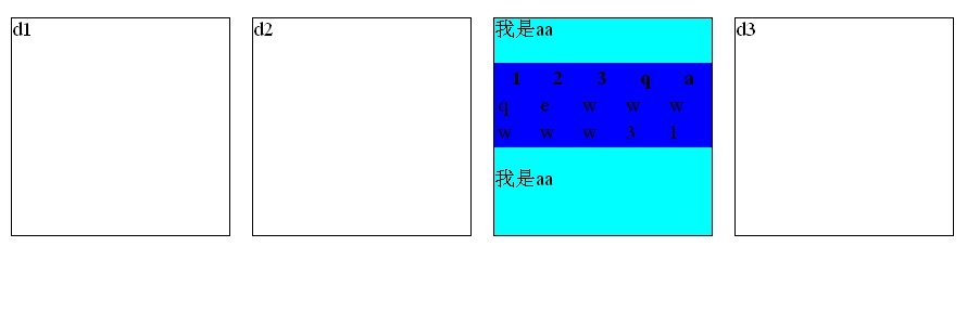 <!DOCTYPE html PUBLIC "-//W3C//DTD XHTML 1.0 Transitional//EN" "http://www.w3.org/TR/xhtml1/DTD/xhtml1-transitional.dtd"> <html xmlns="http://www.w3.org/1999/xhtml"> <head> <meta http-equiv="Content-Type" content="text/html; charset=utf-8" /> <title>无标题文档</title> <style type="text/css"> div{border:1px solid #000; width:200px; height:200px; margin:10px; float:left} #aa{background-color:#00FFFF} </style> </head> <body> <div id="d1">d1</div> <div id="d2">d2</div> <div id="aa"> <p>我是aa</p> <table width="100%" border="0" bgcolor="#0000FF"> <tr> <th scope="col">1</th> <th scope="col">2</th> <th scope="col">3</th> <th scope="col">q</th> <th scope="col">a</th> </tr> <tr> <td>q</td> <td>e</td> <td>w</td> <td>w</td> <td>w</td> </tr> <tr> <td>w</td> <td>w</td> <td>w</td> <td>3</td> <td>1</td> </tr> </table> <p>我是aa</p> </div> <div id="d4">d3</div> </body> </html> <script type="text/javascript"> document.onclick = hideAA; function hideAA(e){ var src = e?e.target:event.srcElement; do{ if(src.id =="aa") return; src = src.parentNode; }while(src.parentNode) document.getElementById("aa").style.display = "none"; } </script> |
