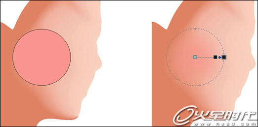 绘制圆形并填充颜色,然后为圆形添加射线透明,调整一下透明滑块,得到一个边缘透明的圆形。(注:如果觉得腮红挡住了脸部,可将灰色拖到中间的透明滑块中)