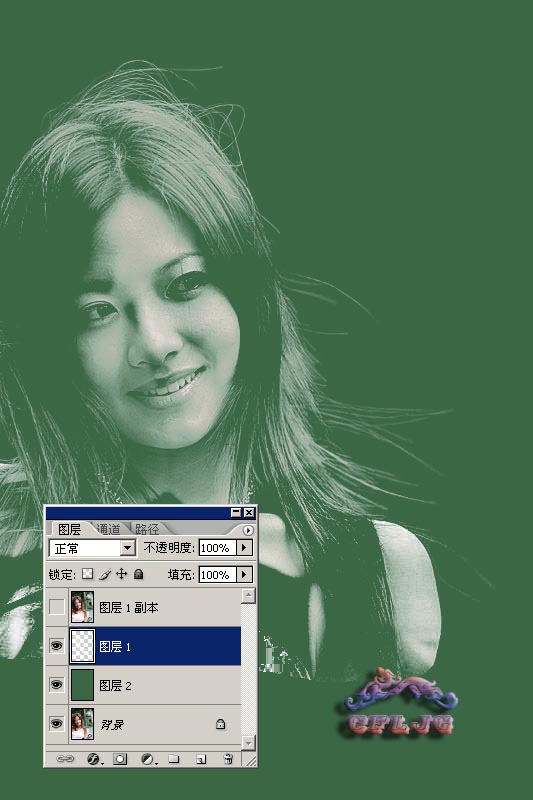 01、打开图片,ctrl+j两次,得到图层1和图层1副本。点击红圈处,创建新图层,得到图层2把这层放于图层1与背景层之间,并填充颜色,这里填充了绿色,作为检验效果和新的背景层。