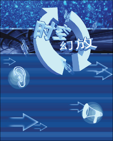 我们用3D文字制作工具制作出“音符”、“喇叭”和“耳朵”的立体形象。执行【文件】|【打开…】命令,打开“music.bmp”文件。按照前面制作“时空”、“幻放”立体字的方法,选取图像,拷贝图像到“海报”窗口中,通过执行【编辑】|【自由变换】(快捷键Ctrl+T)改变图像的大小,拖动图像到合适的位置。执行【图像】|【调整】|【去色】命令(快捷键Shift+Ctrl+U)去除颜色。执行【图像】|【调整】|【色彩平衡】命令(快捷键Ctrl+B)调整图像颜色,这里就不一一列出色彩平衡的参数,读者可以自己尝试调整颜色参数,只要颜色符合整个海报的基本色调既可。
