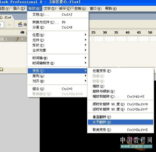 四、回到场景中,打开库,把“心动2”影片剪辑元件拖到场景中,然后按Ctrl+C复制,再按Ctrl+Shift+V粘贴到原处,点下粘贴后的那个心元件,然后选择修改——变形——水平翻转。