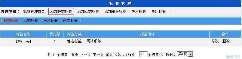 在后台的“网站管理导航”中,单击“系统设置”->“标签管理”,右栏出现“标签管理”的界面: